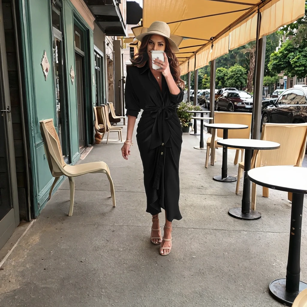 Women's Elegant Solid Summer Shirt Dress Long Sleeve Lapel Neck Button Closure Fall/Winter Maxi Satin Candy Color Belted Ruched